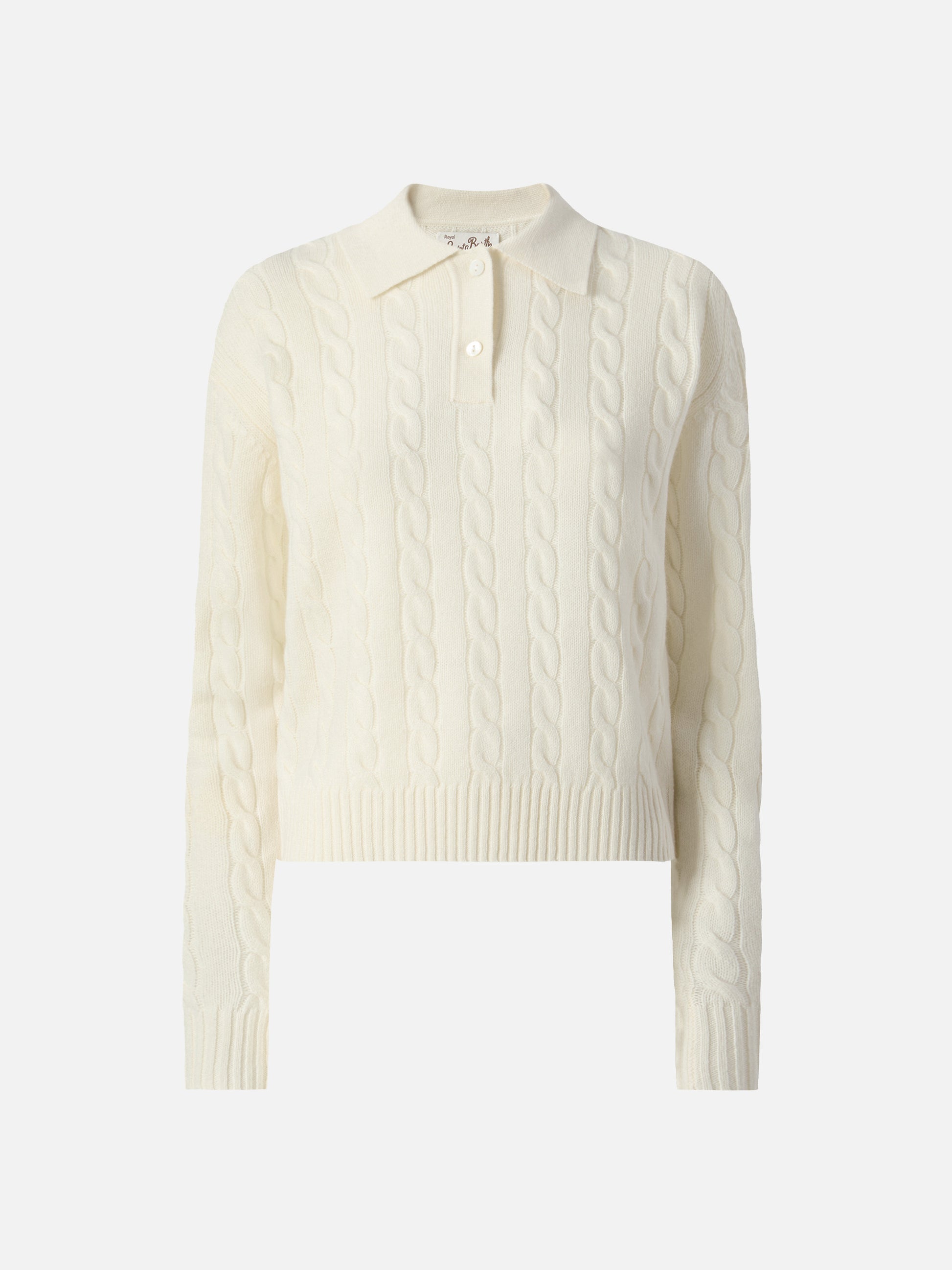 Savoy soft-touch cable-knit merino wool polo sweater in white