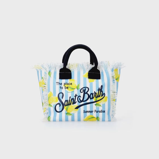 Introducing our Colette cotton canvas beach bag – a summer essential that goes beyond the shores, perfect for embracing the sun-kissed vibes wherever you go. Crafted from durable and lightweight cotton canvas, this bag is thoughtfully designed for beach outings, summer escapades, and leisurely moments. Its spacious interior provides ample room for your beach essentials, towels, and more. With a vibrant and stylish design, this bag effortlessly transitions from sandy shores to city streets. The sturdy handles ensure easy carrying, while the versatile style makes it a perfect companion for your free time, casual outings, or holiday adventures. Embrace the laid-back charm of summer with our Colette Handbag – your go-to accessory for all things sunny and carefree Colette cotton canvas fringed handbag Lemon all over print on light blue striped all over print Saint Barth signature printed logo Inner flap with zip Inside pocket with zip Sizes: 30 x 22 x 15 cm Composition: 100% cotton