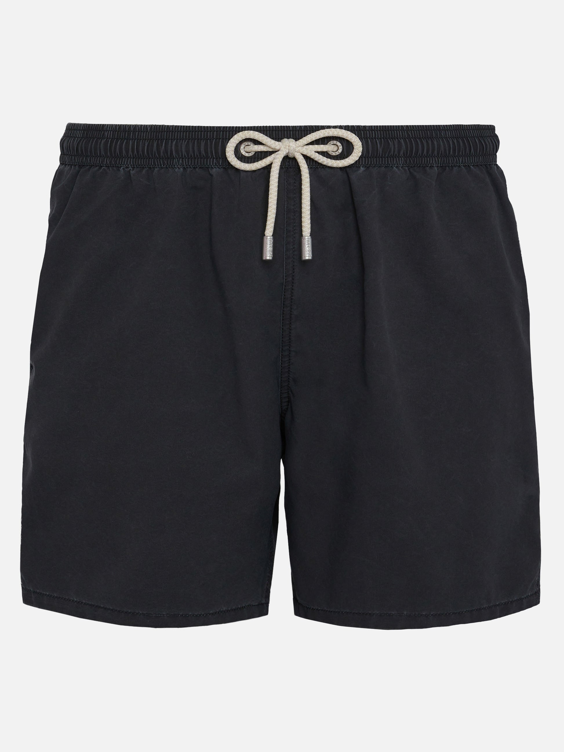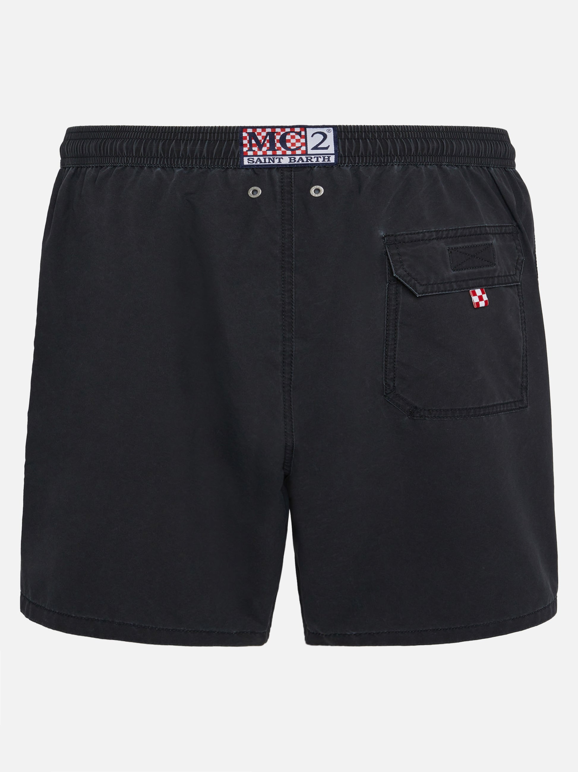 Introducing our Patmos swim shorts, crafted from textured polyester fabric, offering a cotton-like touch. Enhanced with contrast stitching and drawstring, as well as the embroidered exclusive Saint Barth logo detail at the bottom leg. Features a back pocket with flap and velcro closure. This version is made from fast-drying fabric. The beauty of this garment lies in the unique fabric processing technique, which begins with an initial fabric plating, followed by a gentle washing treatment once the garment is made. This process creates a one-of-a-kind vintage effect, particularly in the stitching. Every imperfection is considered a feature, making each piece truly unique. Man Patmos mid-length swim shorts Vintage black color Texturized cotton touch Exclusive Saint Barth logo detail at the bottom leg Comfortable elasticized waistband Adjustable drawcord with branded terminals Antibacterial inner mesh lining Side pockets with French seams Back patch pocket with velcro closure Branded eyelets designed to drain water and prevent ballooning effect MC2 Saint Barth exclusive label on the back Classic fit Composition: 100% polyester Size L has a half waistband width of 52,5 cm (stretched) and varies by 2 cm for each size