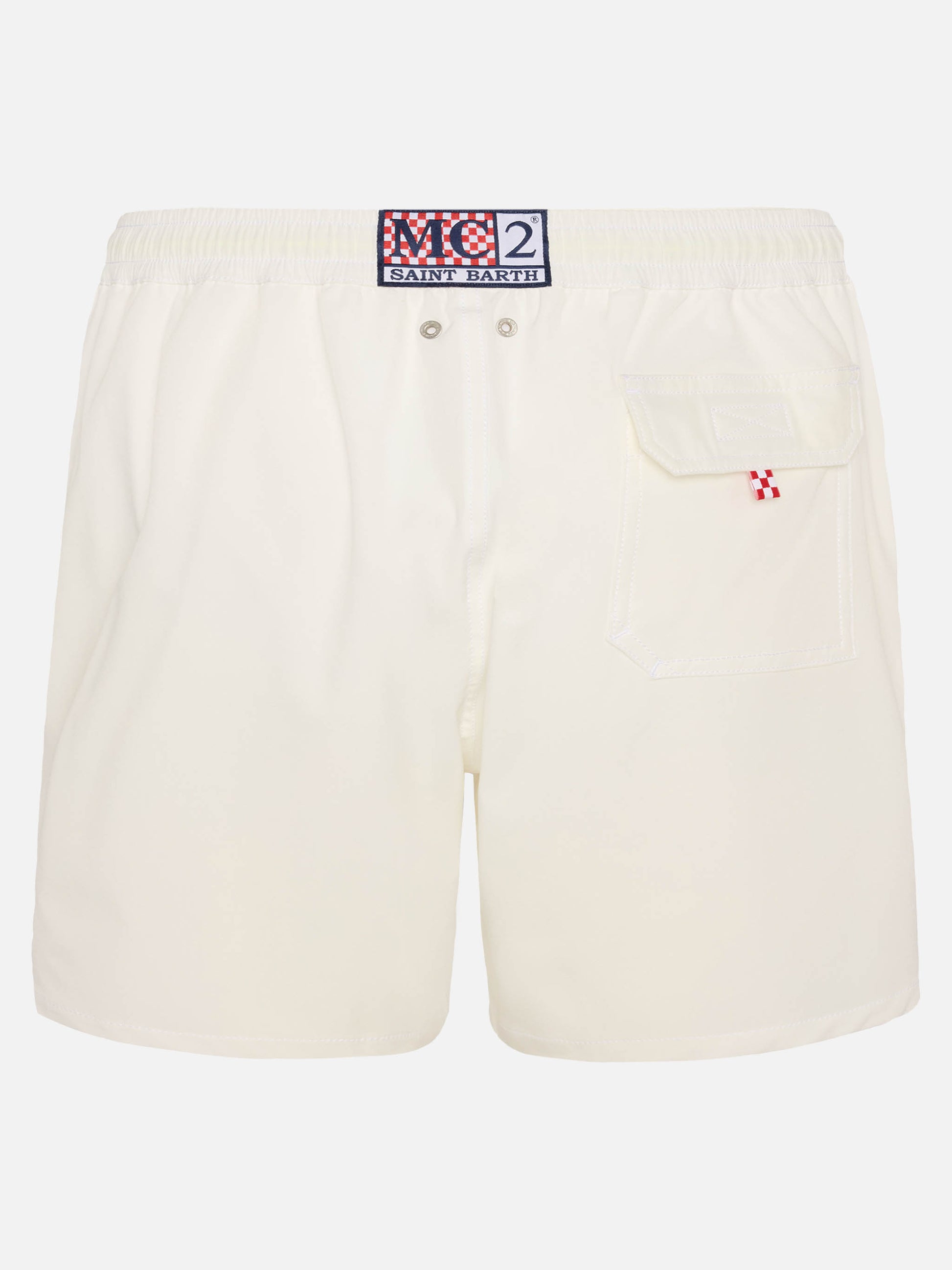 Man Comfort swim shorts White plain color Relaxed fit Side on-seam pockets Back right velcro pocket Signature embroidered St. Barth on the left hem MC2 Saint Barth label on the back Mesh inner briefs for additional support Branded back eyelets to drain water Composition: 92% RPET, 8% spandex Size large has a 55 cm half waist, a 42,5 cm total length (belt included) and a 31,5 cm of inseam width Elastic drawstring waistband Model is 185 cm and wears a size large Care Instructions: cold wash by running water and neutral soap. Hang to dry. Do not leave to soak and do not dry in contact with other clothing. Do not leave the garment wet in contact with other clothing.