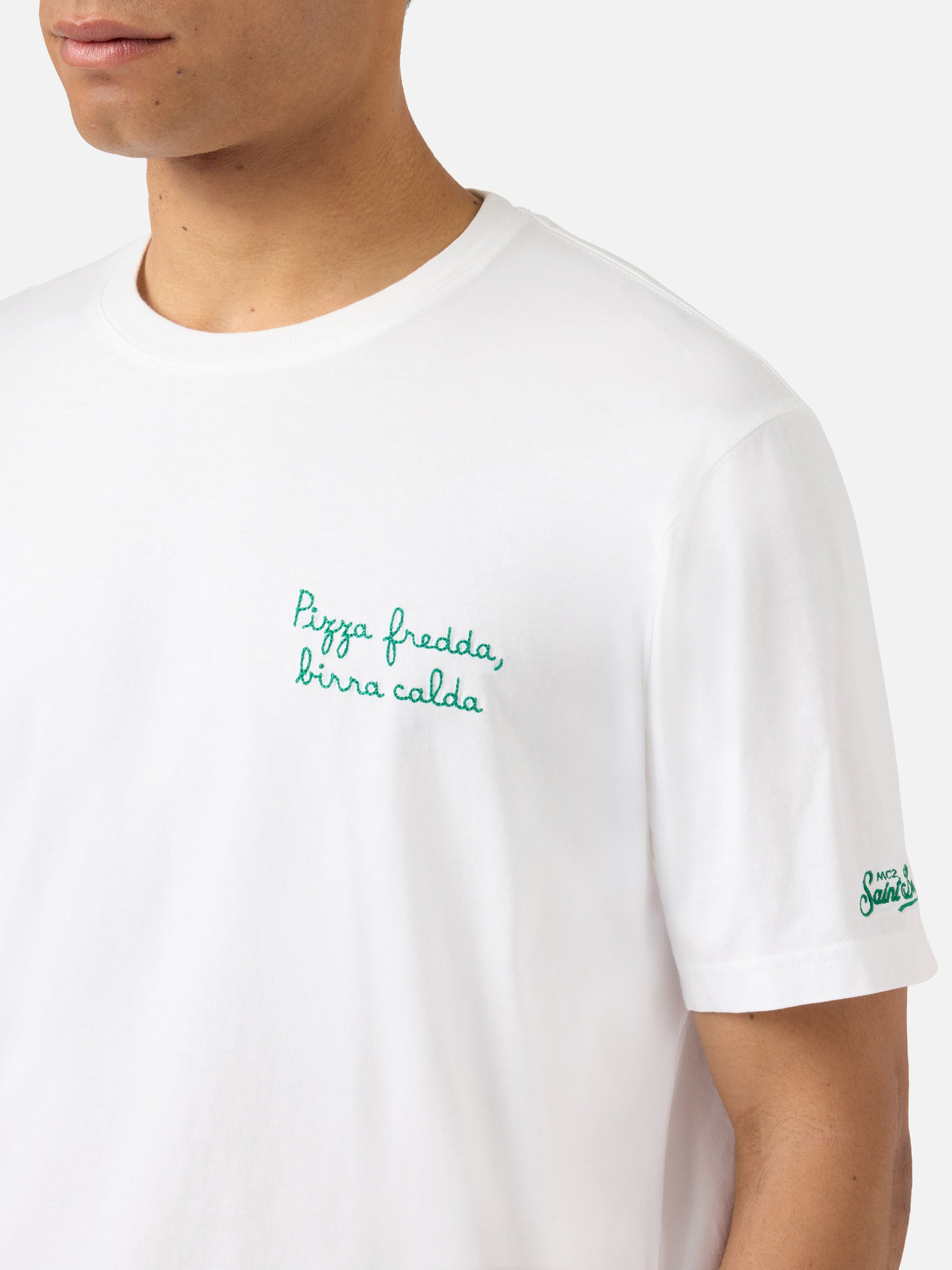 White Portofino T-shirt with Pizza Fredda Birra Calda embroidery