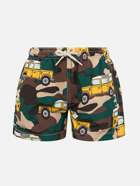 Costume da bagno da bambino in tessuto leggero Jean Lighting con stampa auto fuoristrada