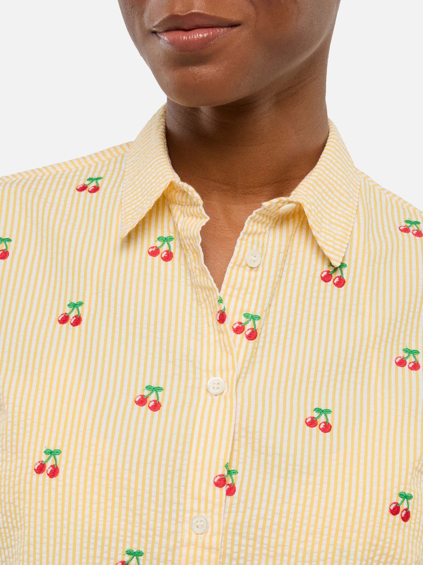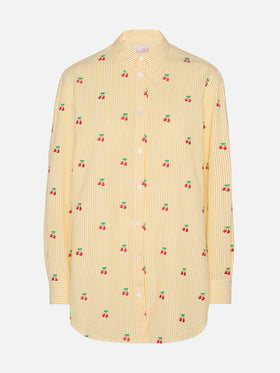 Sagittarius top a triangolo in tessuto seersucker con stampa a righe e ricamo ciliegia