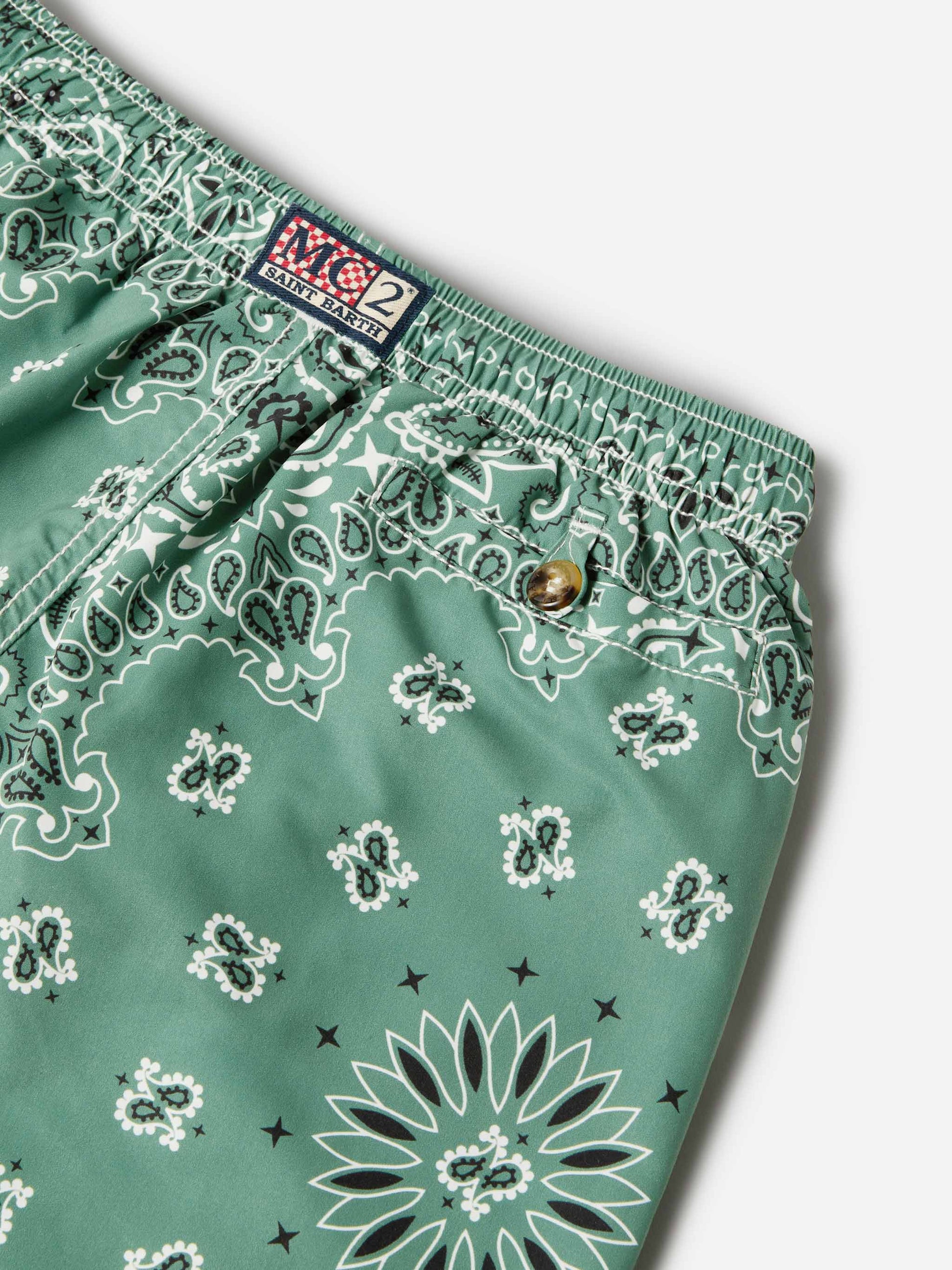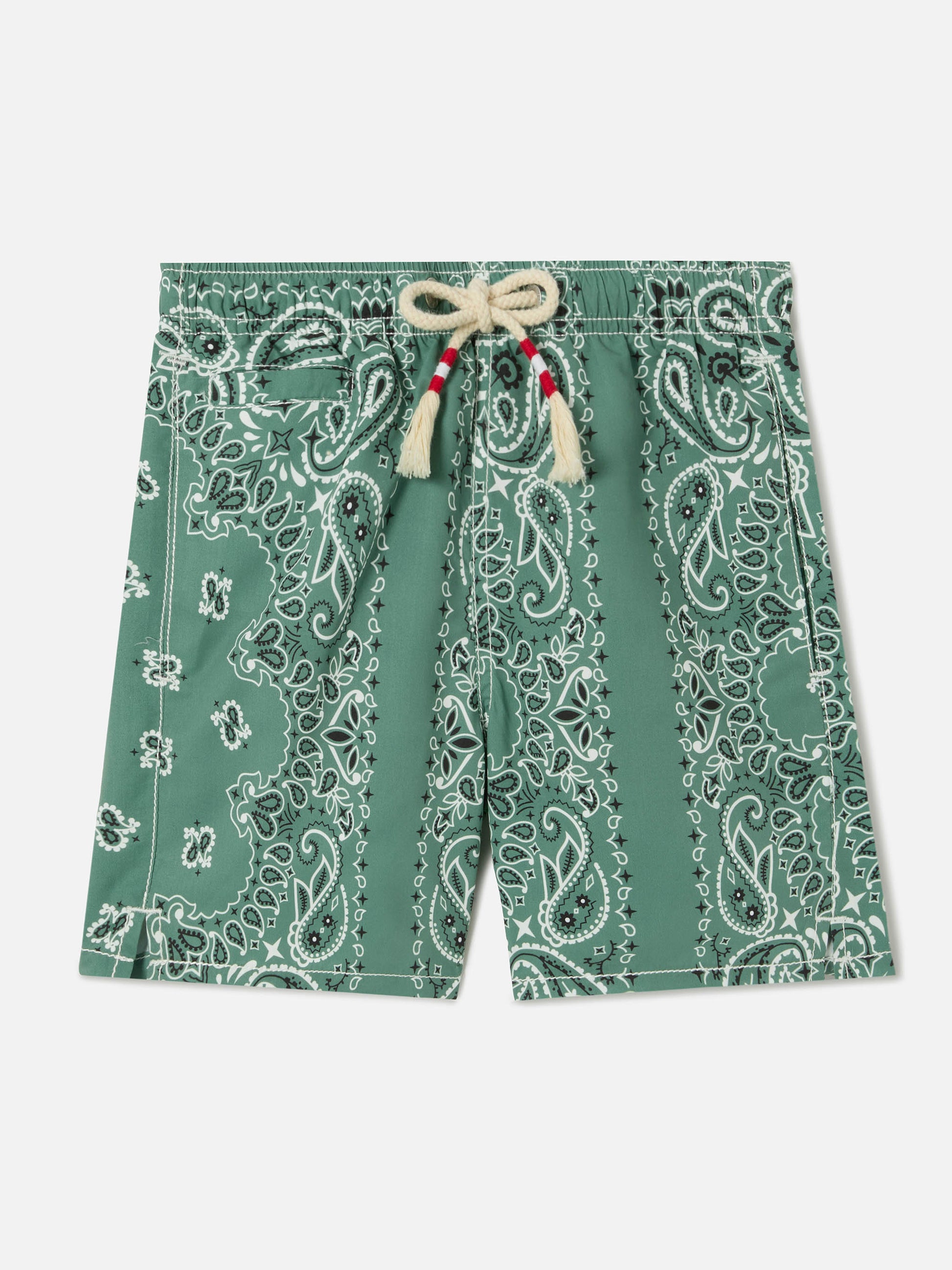 Costume Caprese Jr da bambino Verde Militare Stampa bandana Tessuto leggero e traspirante Vita elasticizzata con coulisse sfrangiata regolabile Due tasche laterali Tasca posteriore con bottone logato Coin pocket anteriore Spacchetti laterali rinforzati Dettagli metallici nickel free