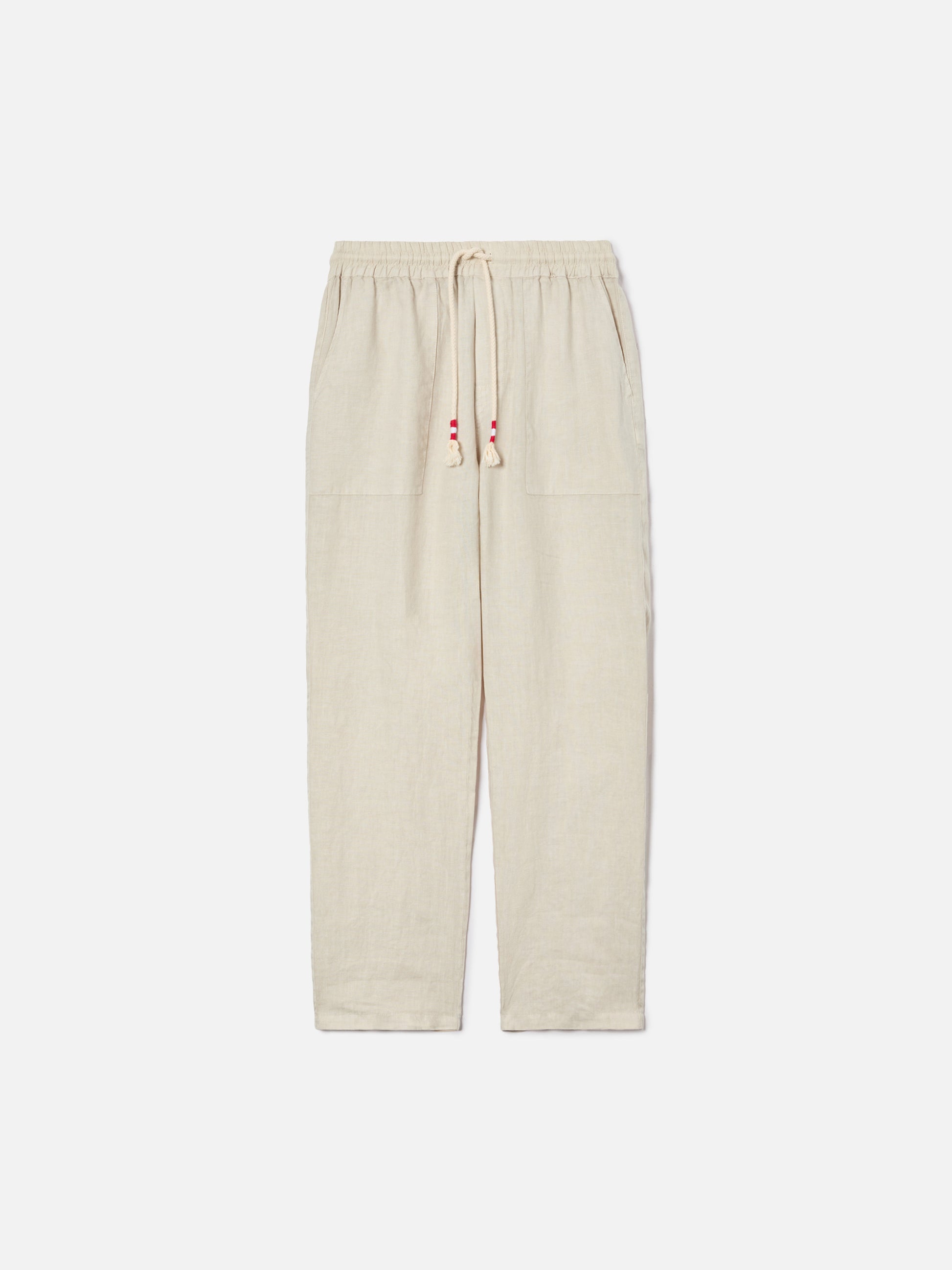 Il pantalone lungo Calais è realizzato in puro lino, un tessuto leggero e traspirante pensato per offrire comfort e naturalezza. Il design tinta unita valorizza l’estetica essenziale del modello. La cintura elasticizzata con coulisse in corda intrecciata con legatura bianco-rossa consente di regolare facilmente la vestibilità. Il modello è completato da tasche oblique sul davanti, tasche posteriori con aletta e bottoni logati ed etichetta logata applicata al centro sul retro della cintura. La gamba dritta e la vestibilità relaxed assicurano comfort e libertà di movimento.
