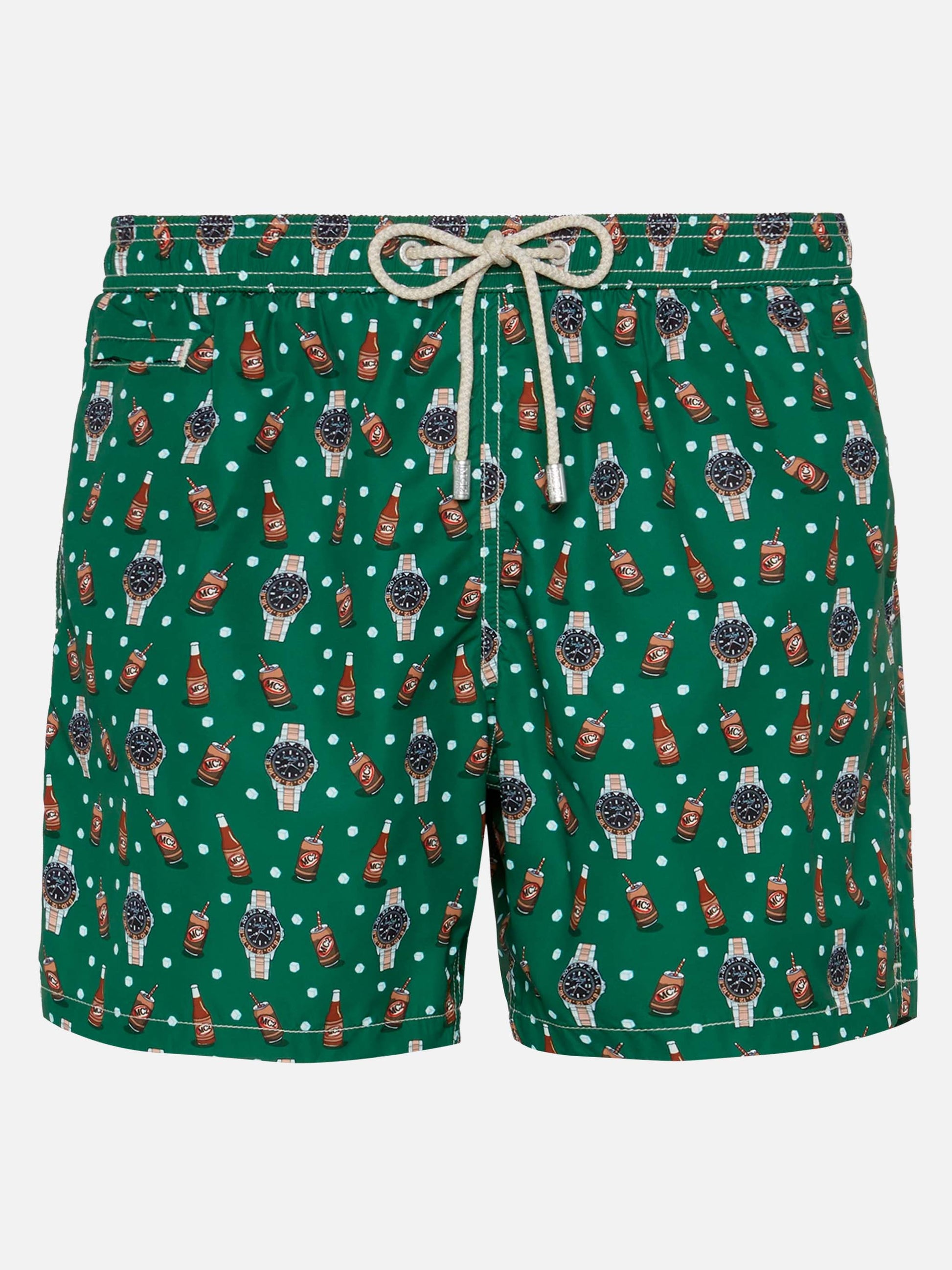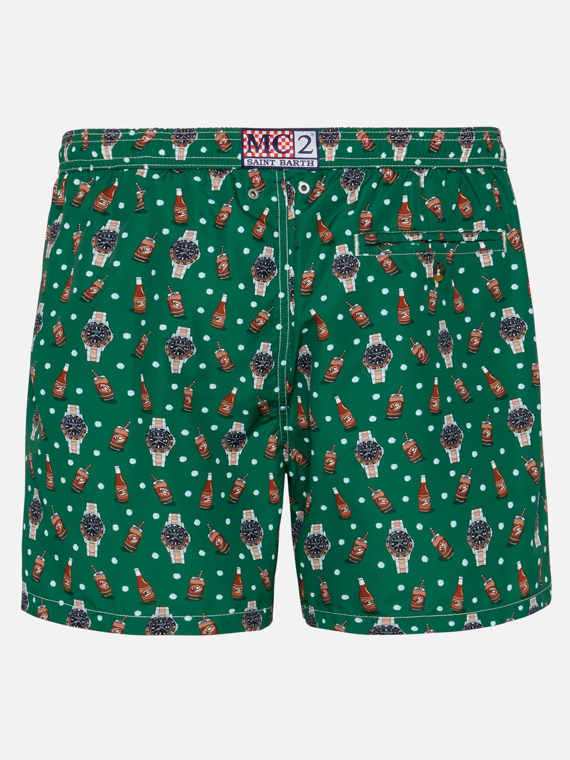 Costume mare Lighting in tessuto leggero con stampa orologi e birra