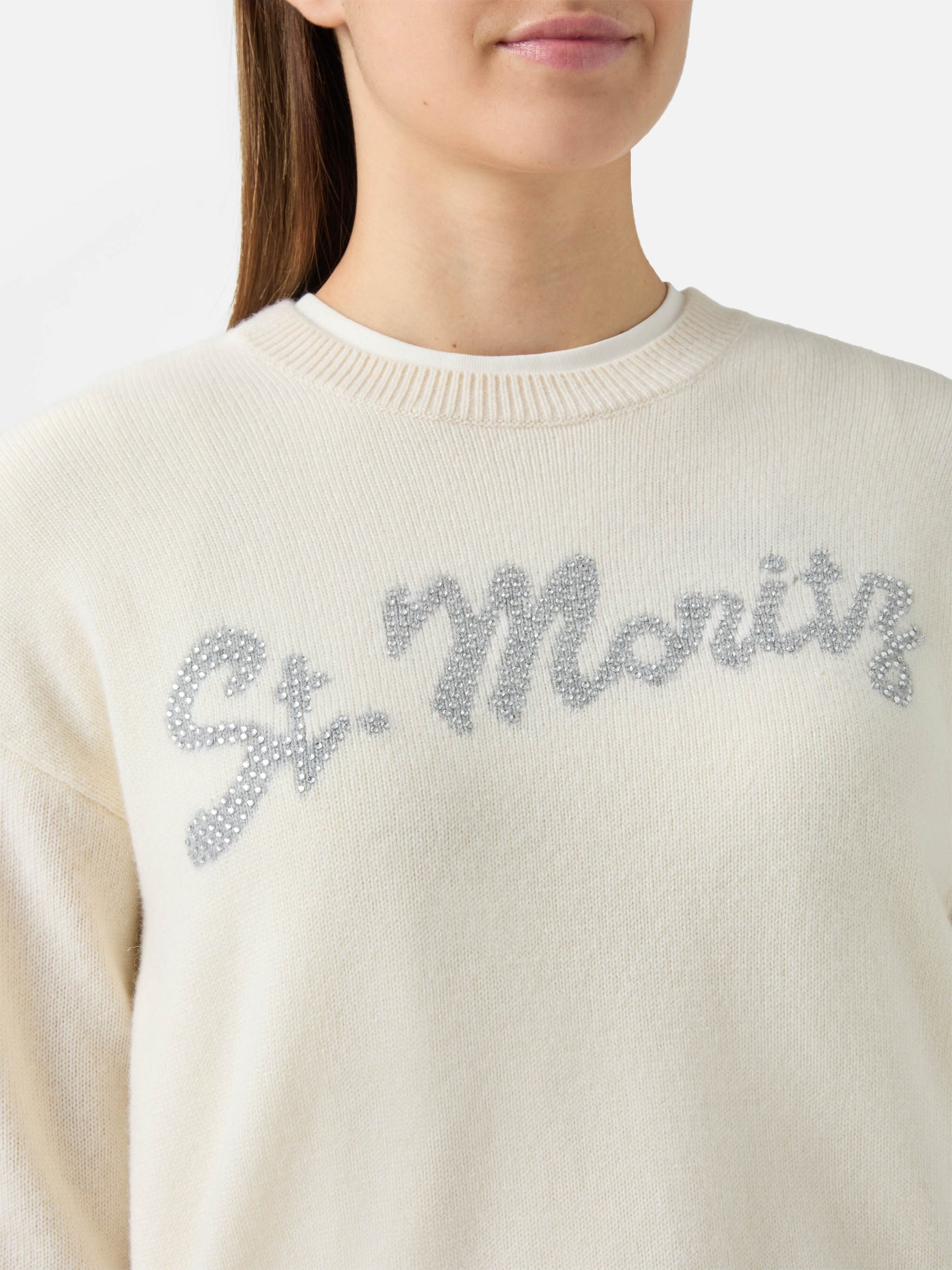 Maglione Louise in cashmere bianco con applicazione St. Moritz in strass