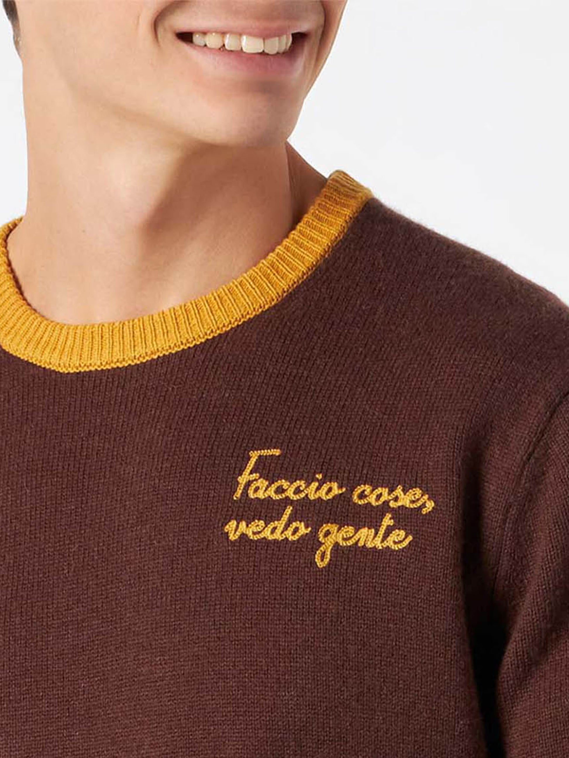 Maglione da uomo marrone con ricamo Faccio cose, vedo gente