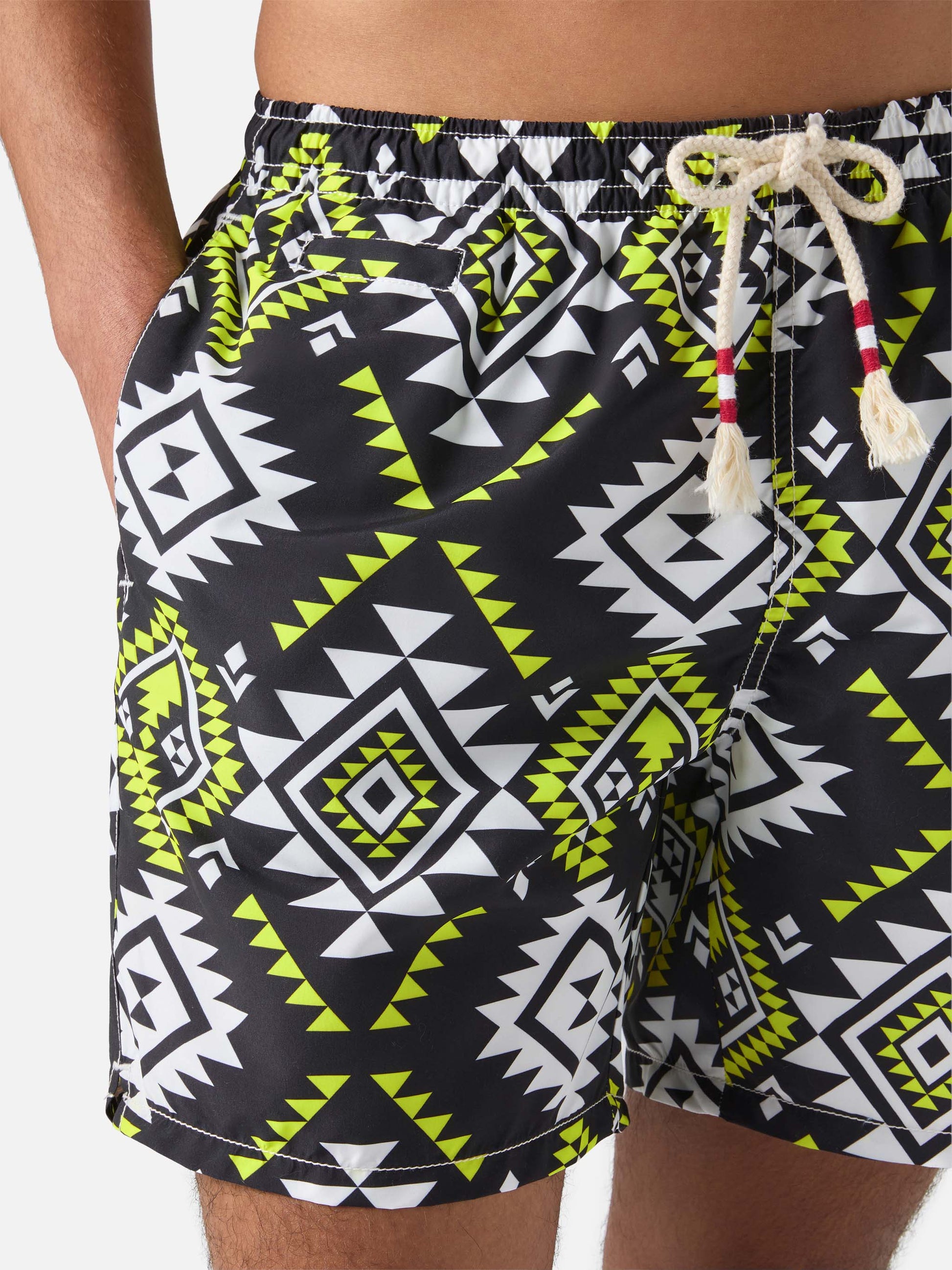 Costume mare da uomo di media lunghezza Tessuto mano pesca intrecciato a mano Stampa all-over etnica Colore bianco e nero Vita elasticizzata per un maggiore comfort Coulisse regolabile effetto corda Slip interno in rete Tasche laterali con cuciture alla francese Tasca posteriore con chiusura a bottone Micro tasca a filetto sul davanti a destra Vestibilità regolare Composizione: 100% poliestere riciclato La taglia L ha una larghezza mezza vita di 52 cm (stesa) e varia di 2 cm per ogni taglia; lunghezza laterale inclusa la fascia elastica di 42 cm e varia di 1 cm per ogni taglia Si prega di notare che tutte le misure fornite sono approssimative e soggette a una tolleranza di 12 cm a causa della misurazione manuale. Questo margine di tolleranza è normale e previsto. Il modello è alto 185 cm e indossa una taglia L.