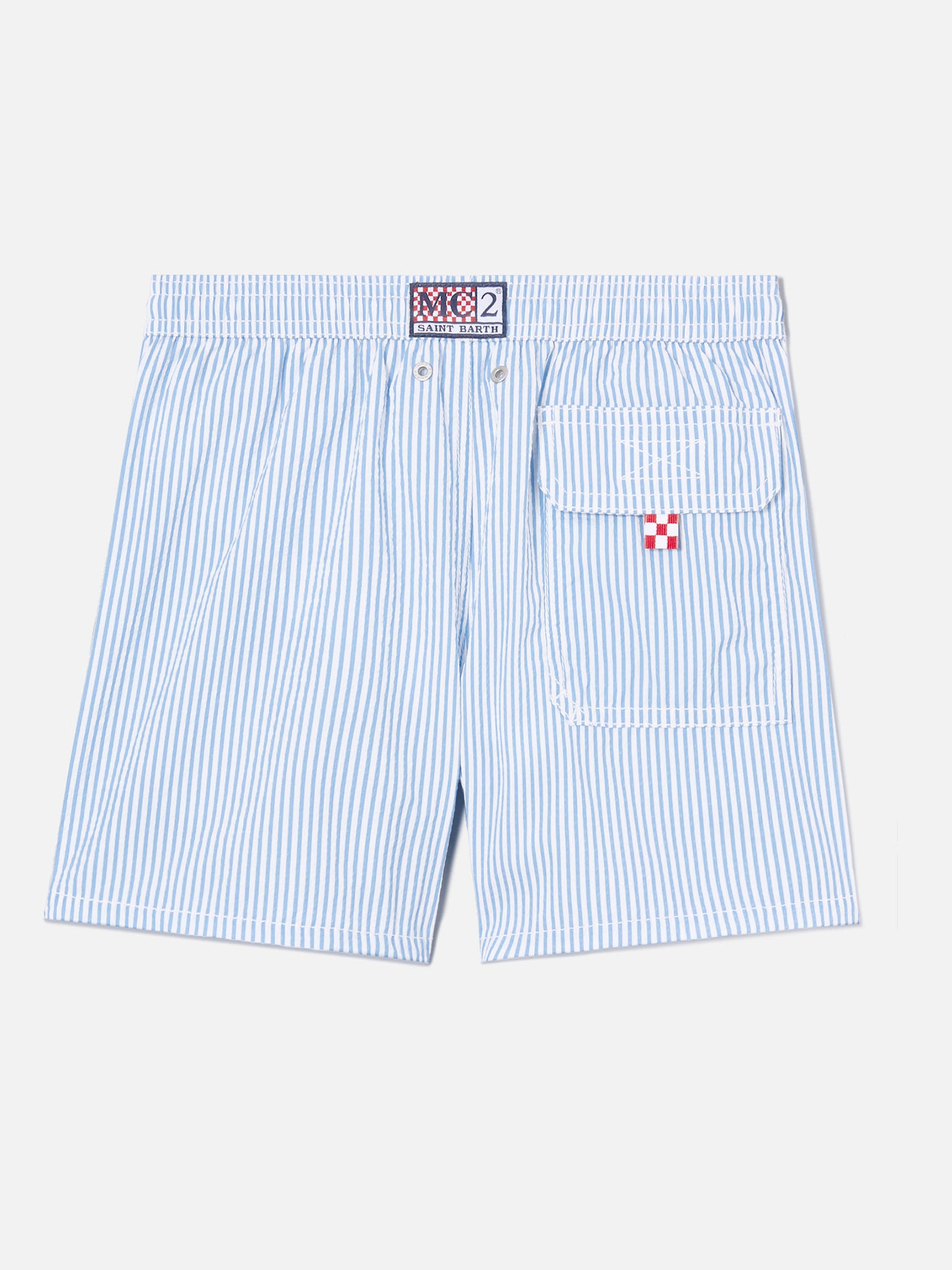 Il costume mare Patmos Jr da bambino è realizzato in tessuto seersucker leggero e traspirante, ideale per le giornate estive. Il fondo azzurro a righe è arricchito dal ricamo St. Barth a contrasto sulla gamba, per un look fresco e iconico. La vita elasticizzata con coulisse regolabile e la retina interna elasticizzata e antibatterica garantiscono comfort e libertà di movimento.