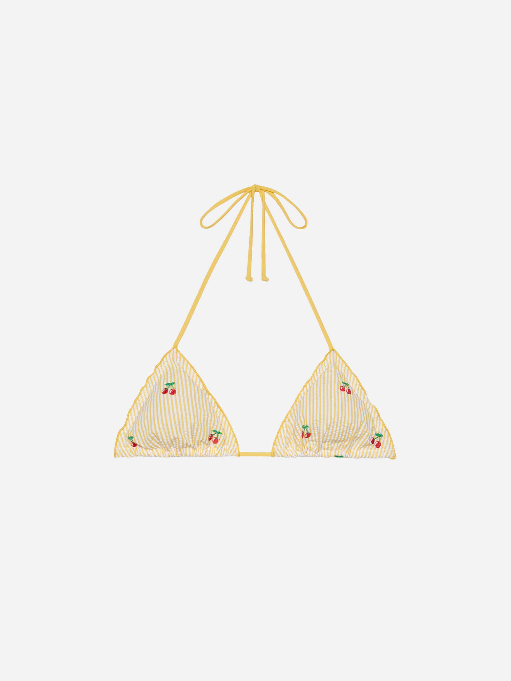 Sagittarius top a triangolo in tessuto seersucker con stampa a righe e ricamo ciliegia