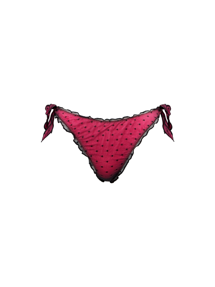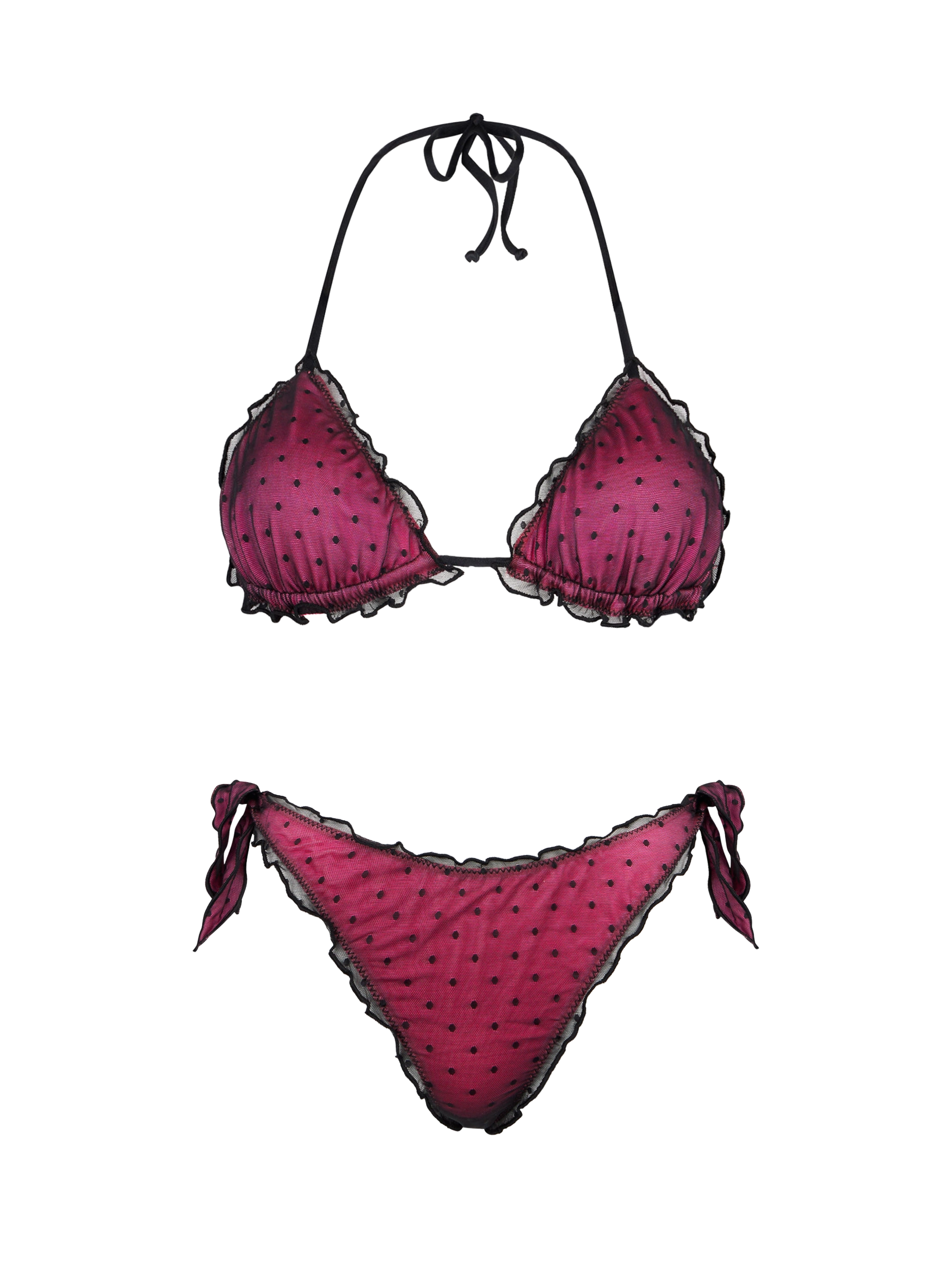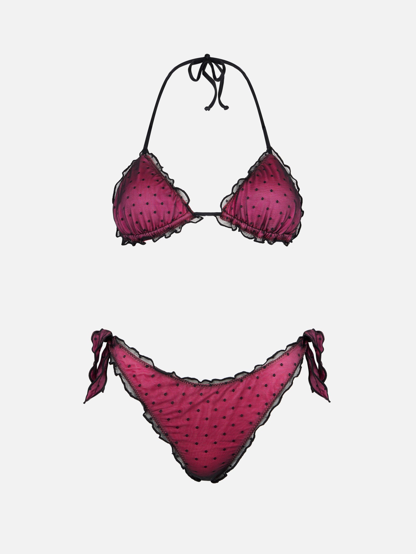 Bikini fucsia lucido con tulle nero a pois