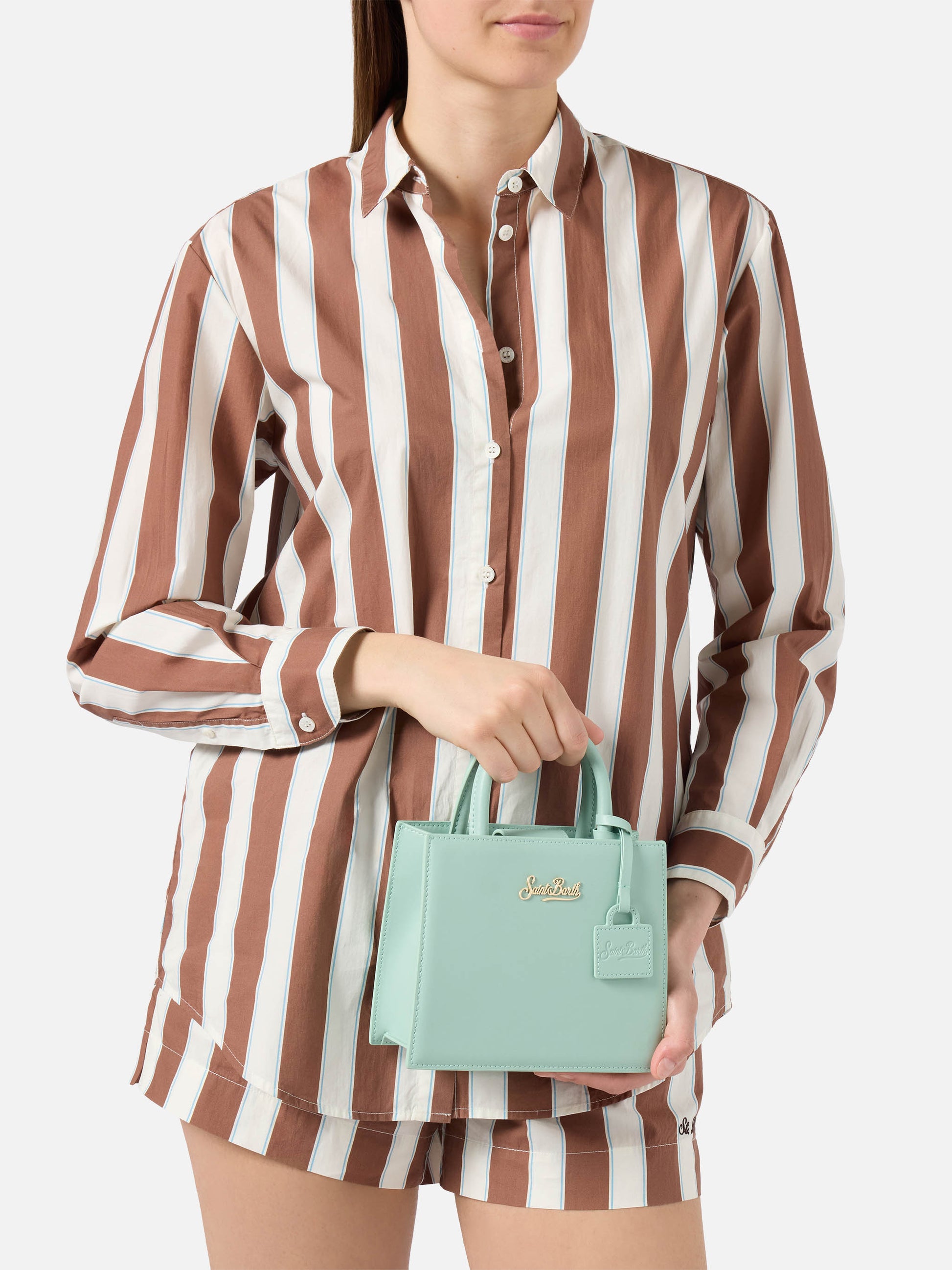 Borsa Shop mini strutturata in pelle liscia verde menta con targhetta metallica