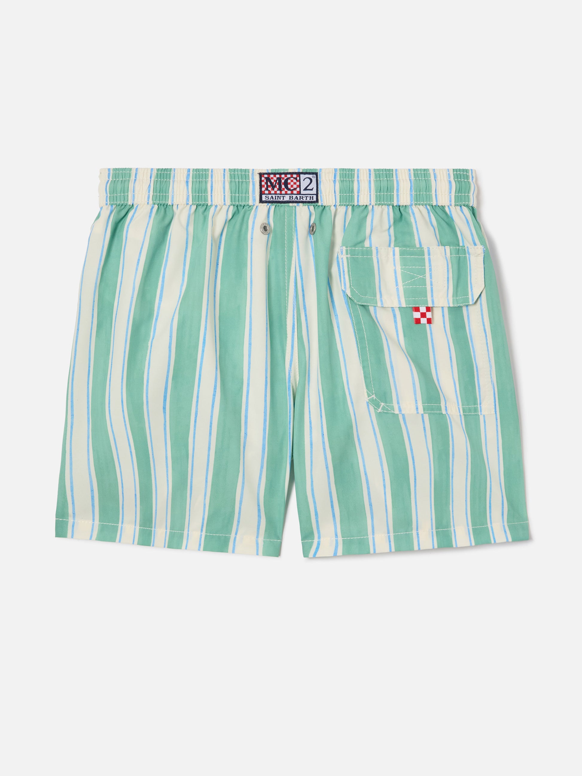 Il costume mare Syros Jr da bambino è realizzato in tessuto leggero e traspirante in poliestere, ideale per le giornate estive. Il fondo bianco con righe verdi e azzurre è impreziosito dal ricamo St. Barth a contrasto sulla gamba, per un look fresco e iconico. La vita elasticizzata con coulisse regolabile e la retina interna elasticizzata e antibatterica assicurano comfort e libertà di movimento.