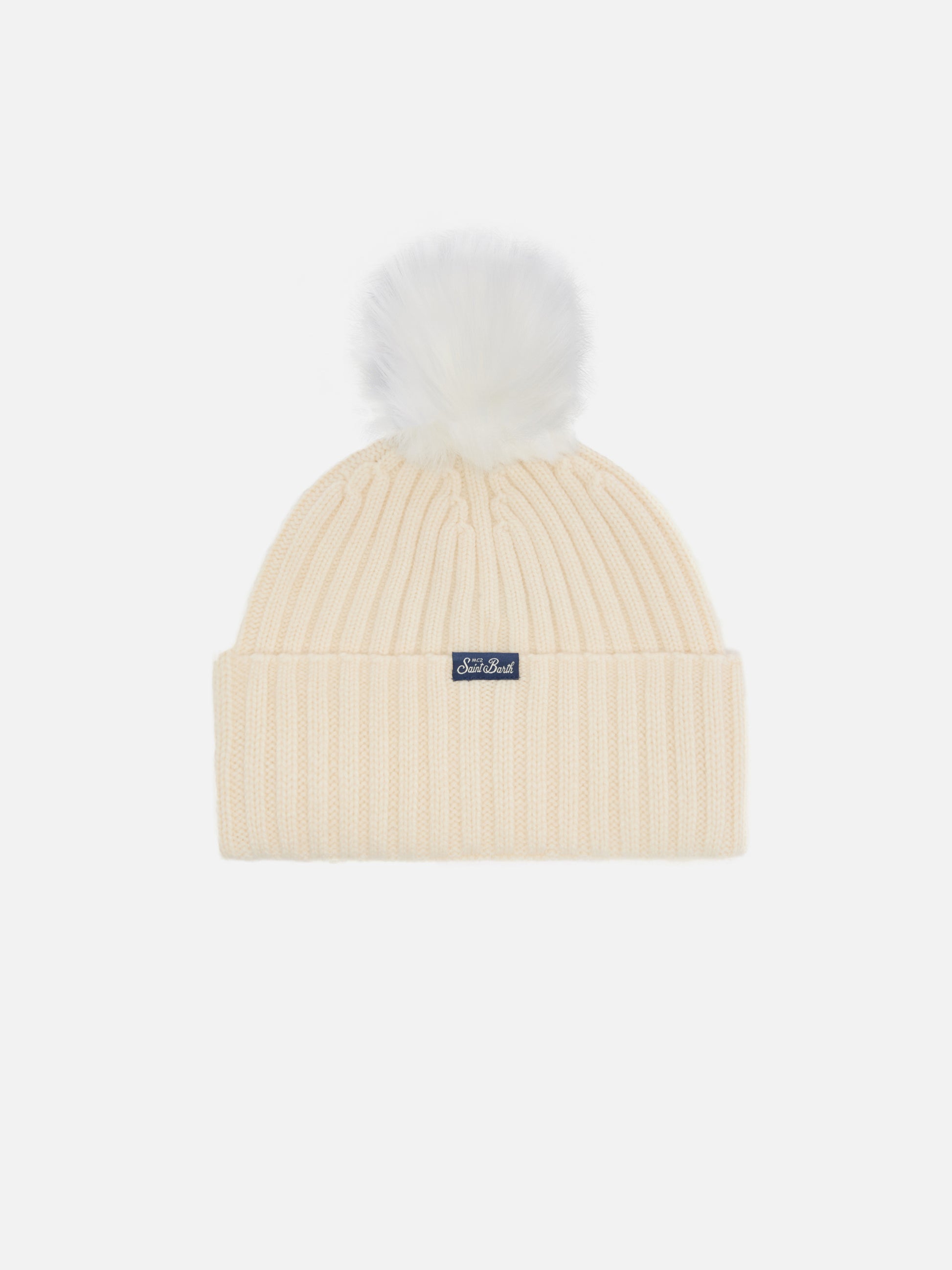 Berretto Wengen in misto cashmere bianco con ricamo lurex Cortina e pompon